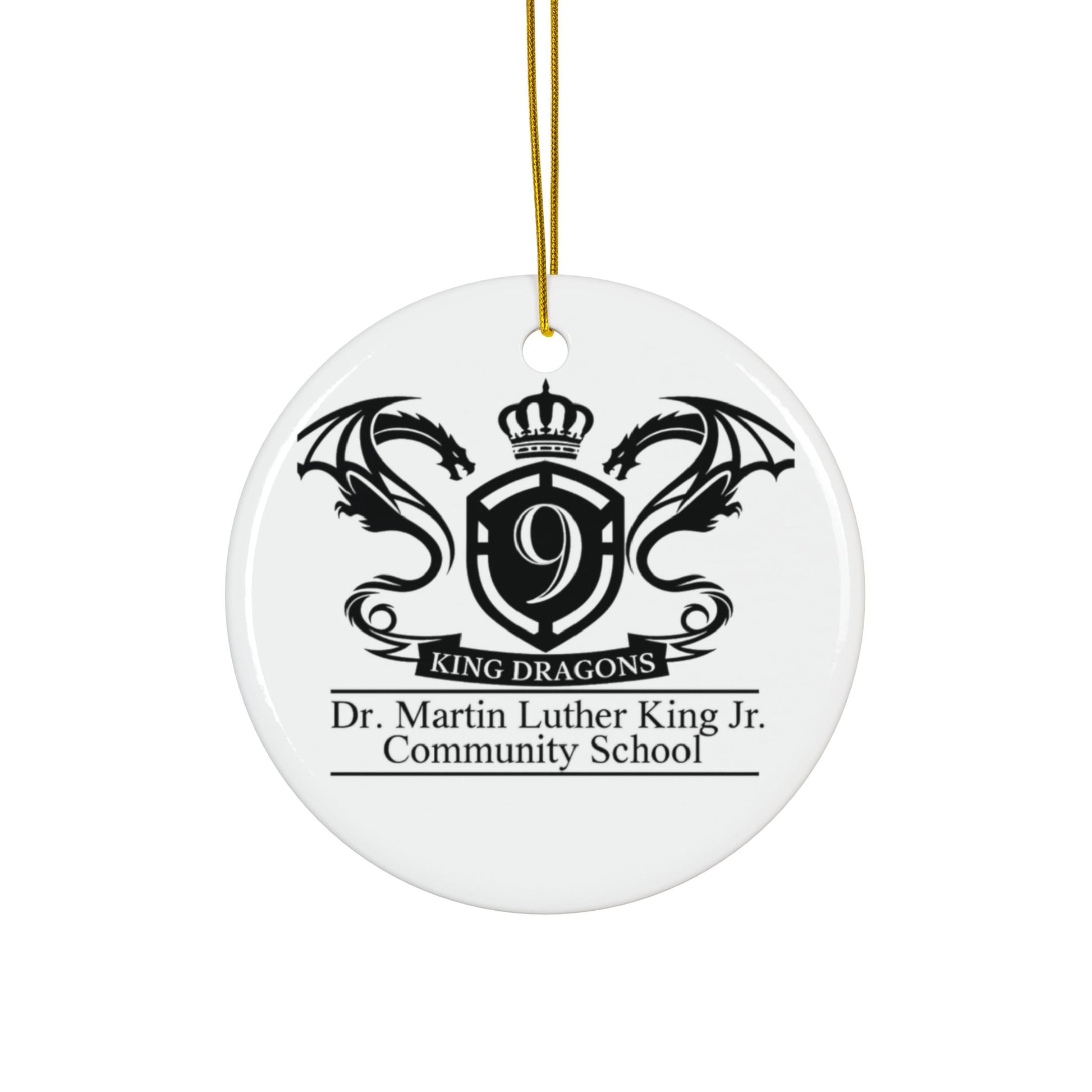 A round ceramic ornament that carries a quiet, proud presence. The double-sided print shows a bold crest with twin dragons, a crown and the text honoring Dr. Martin Luther King Jr. Community School — a piece that reads like a small emblem of school spirit and shared values. The glossy surface gives the black-and-white design crisp contrast, while the included gold hanging string adds a warm, celebratory touch. Available individually or in bundled sets, these ornaments tuck easily into backpacks, hang from classroom displays, or become keepsakes for families and staff who want a tangible reminder of community and achievement.
